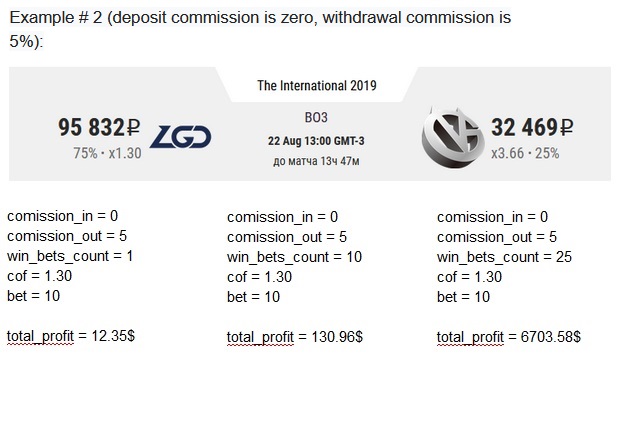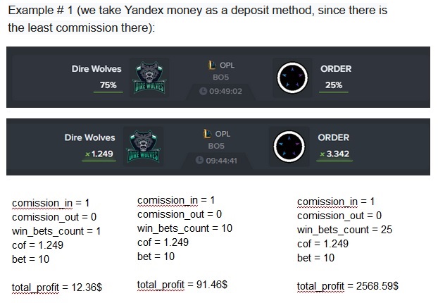 Also, for clarity, we decided to calculate the income for you if you deposit $10 and make different numbers of bets by constantly placing a deposit plus profit from previous bets (sorry that the teams are being different - we were looking for the same percentage for the victory of the teams for the purity of the experiment). You can see the examples on the illustration.